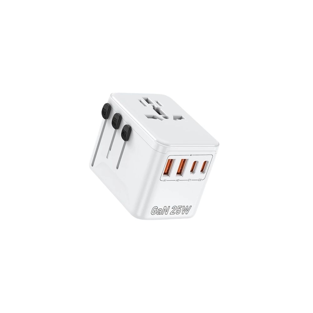 White GaN-based 25W USB-C fast charger with QC3.0, compact and efficient for everyday use.